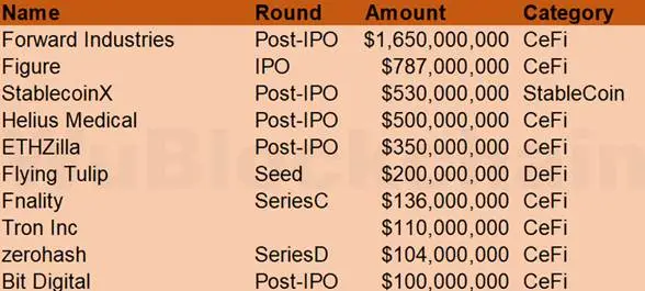 2025年9月总融资金额为51.22亿美元,环比上升5.2%(2025年8月共48.69亿美元),同比上升739.7%(2024年9月共6.1亿美元)。其中,金额排名前10的轮次如下: